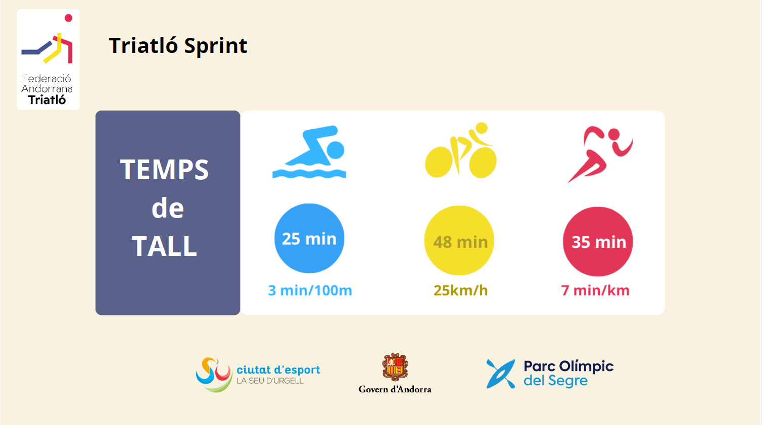 | 08:20 | 09:40 | Entrega dorsales Triatló Super Sprint i Triatló Jove | Village-Parc del Segre |